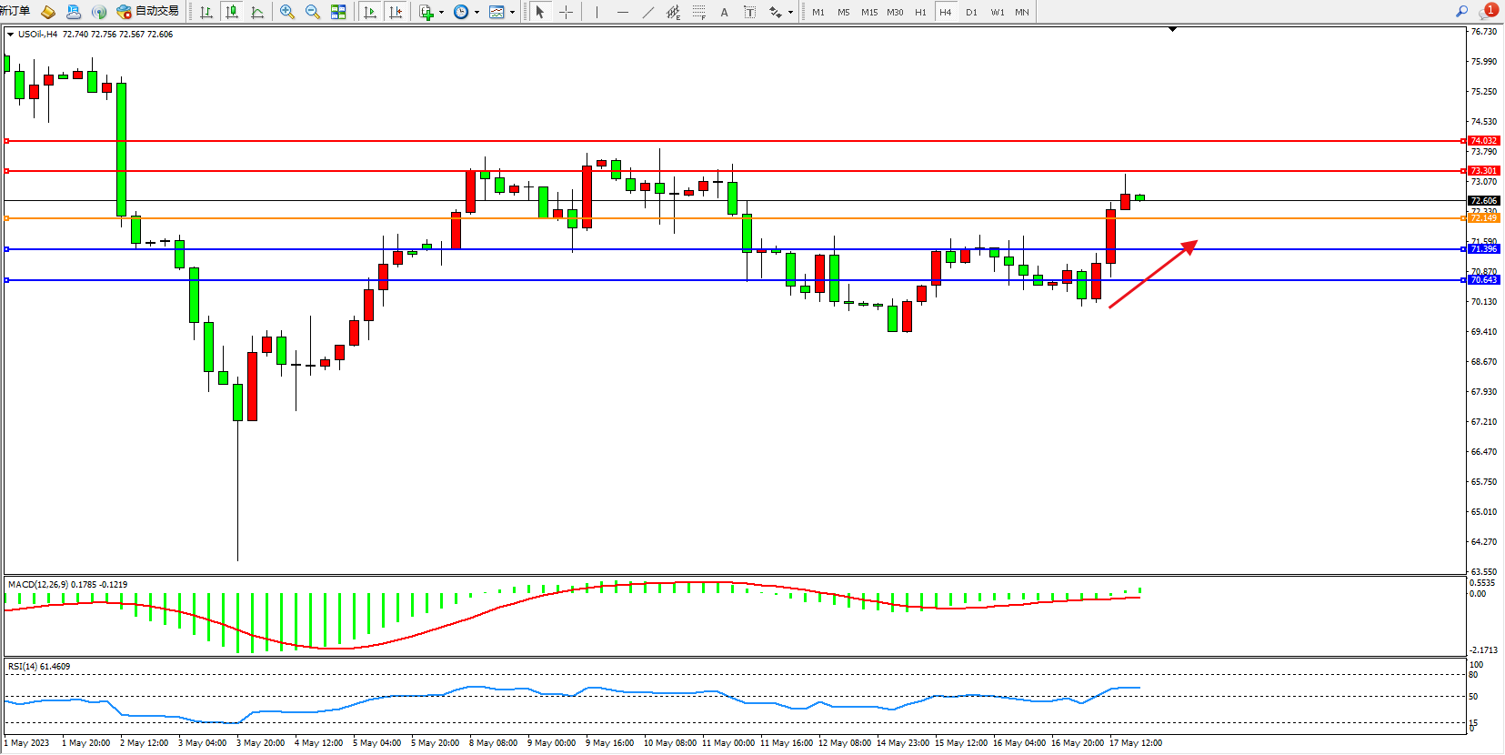 交易策略:72.149上方看涨,目标73.301  74.032