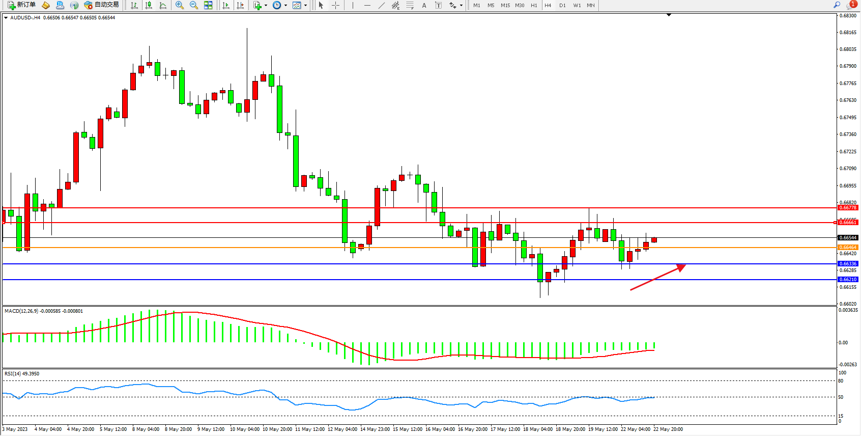 交易策略:0.66464上方看涨,目标0.66661  0.66778