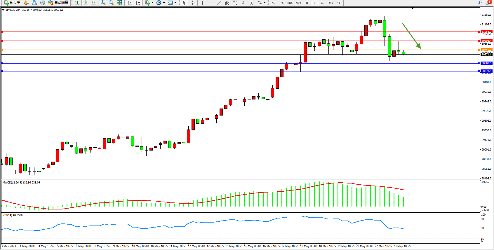日经指数JPN225——4小时K线图显示: