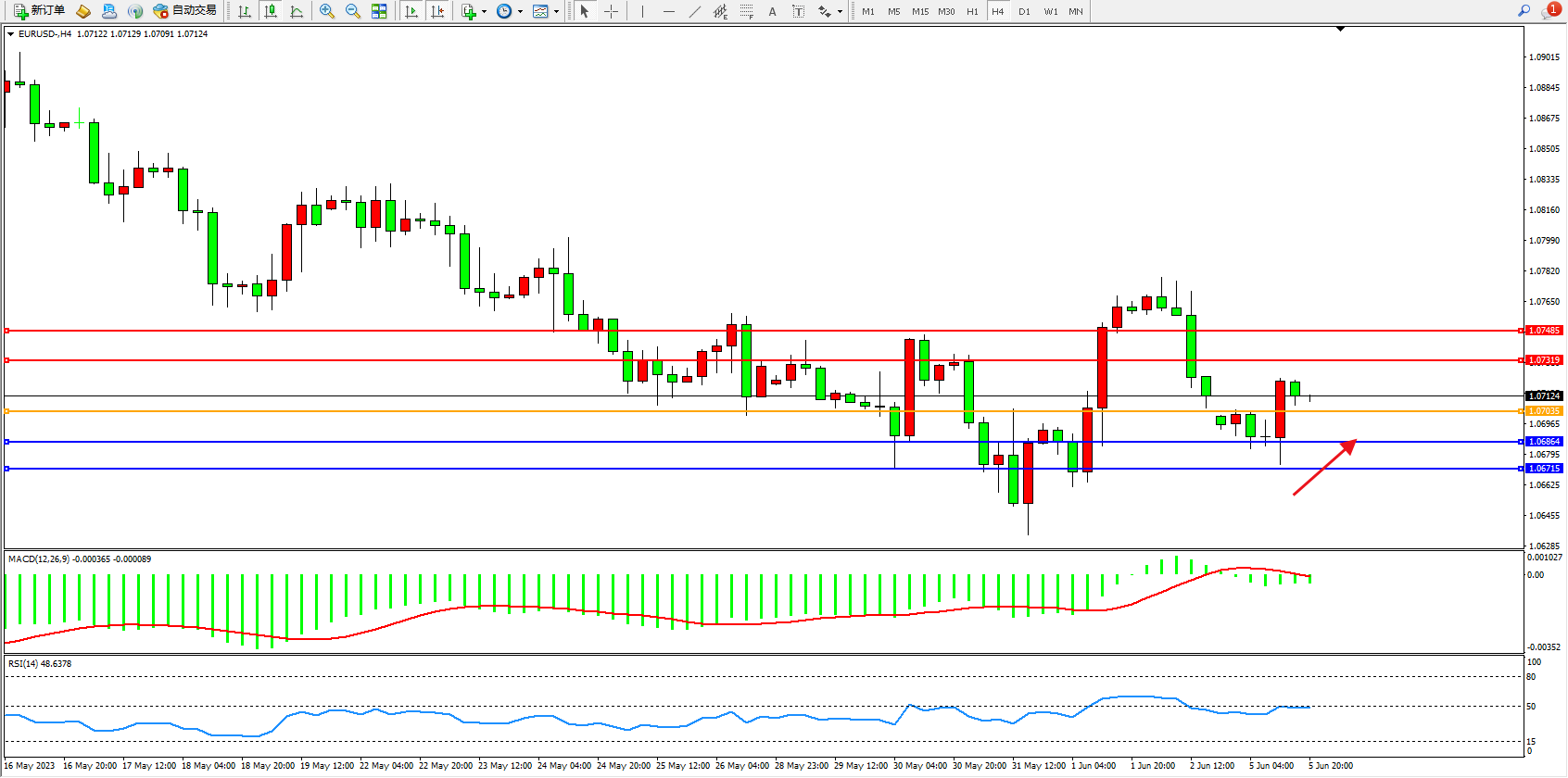 欧元美元EURUSD—4小时K线图显示: