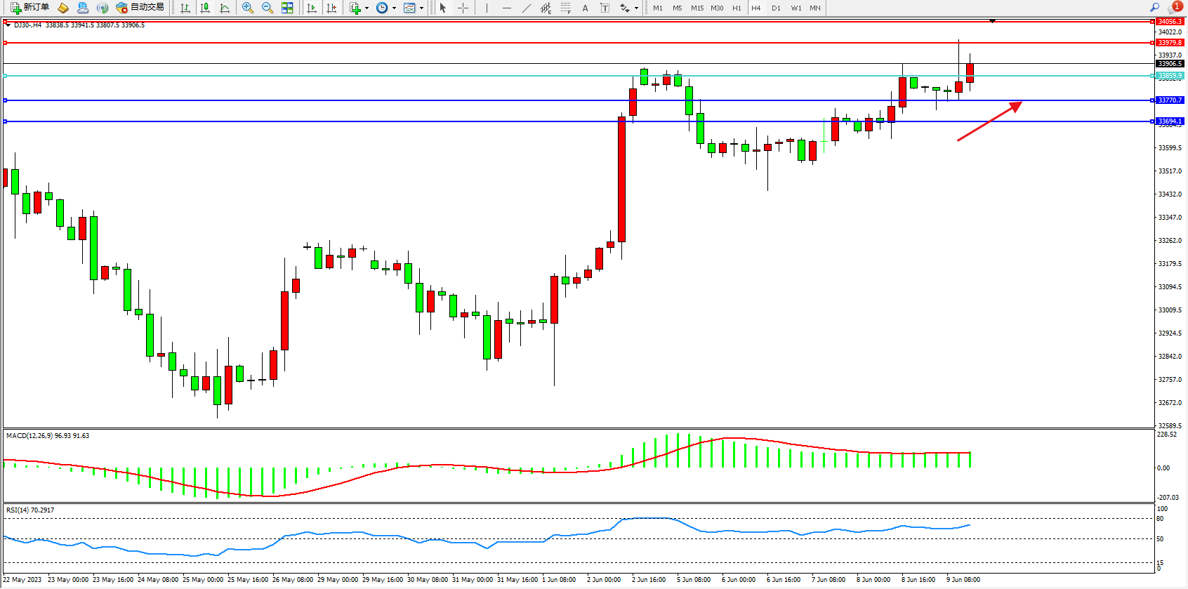 道琼斯指数DJ30——4小时K线图显示: