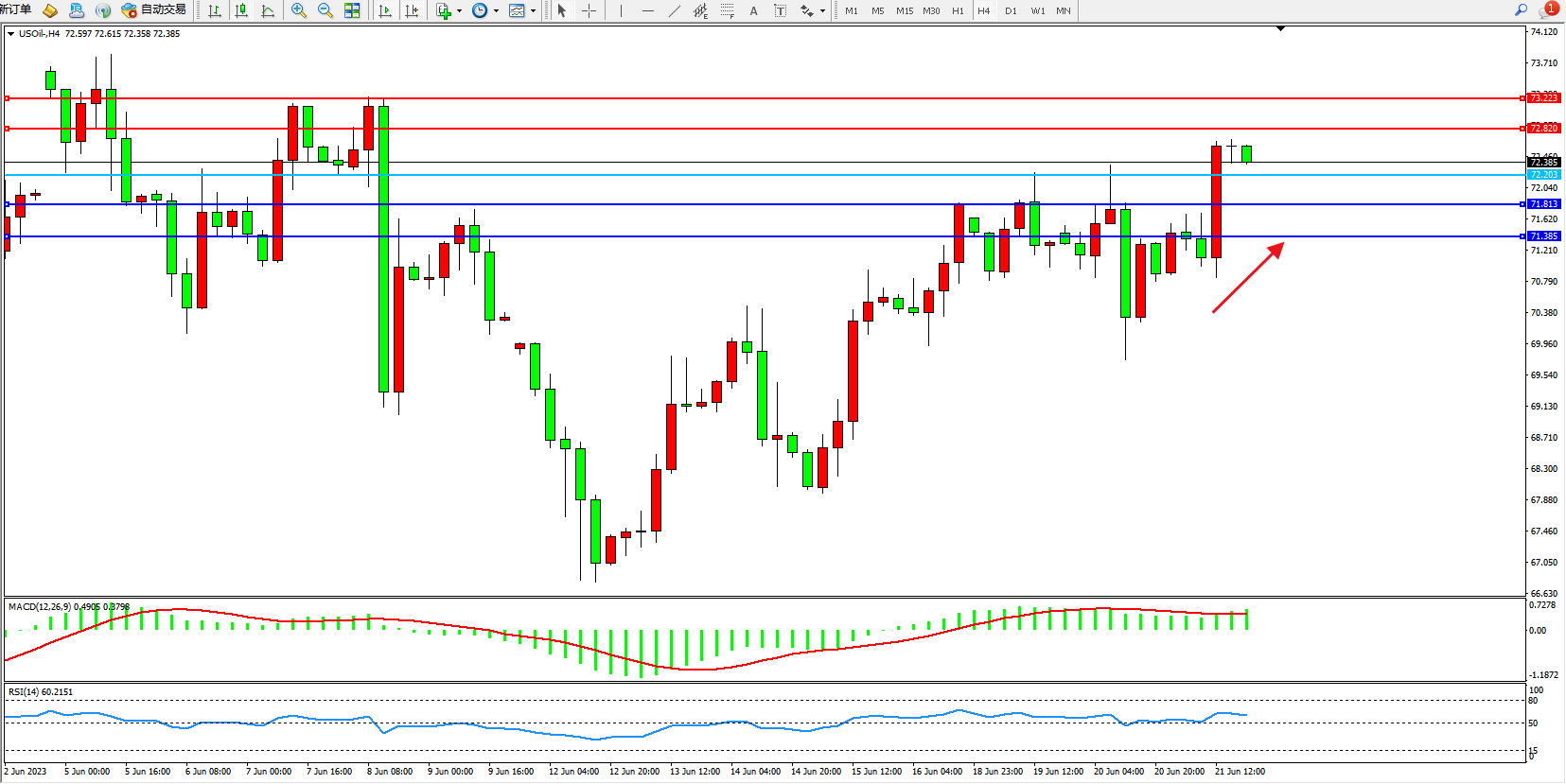 交易策略:72.203上方看涨,目标72.820 73.223