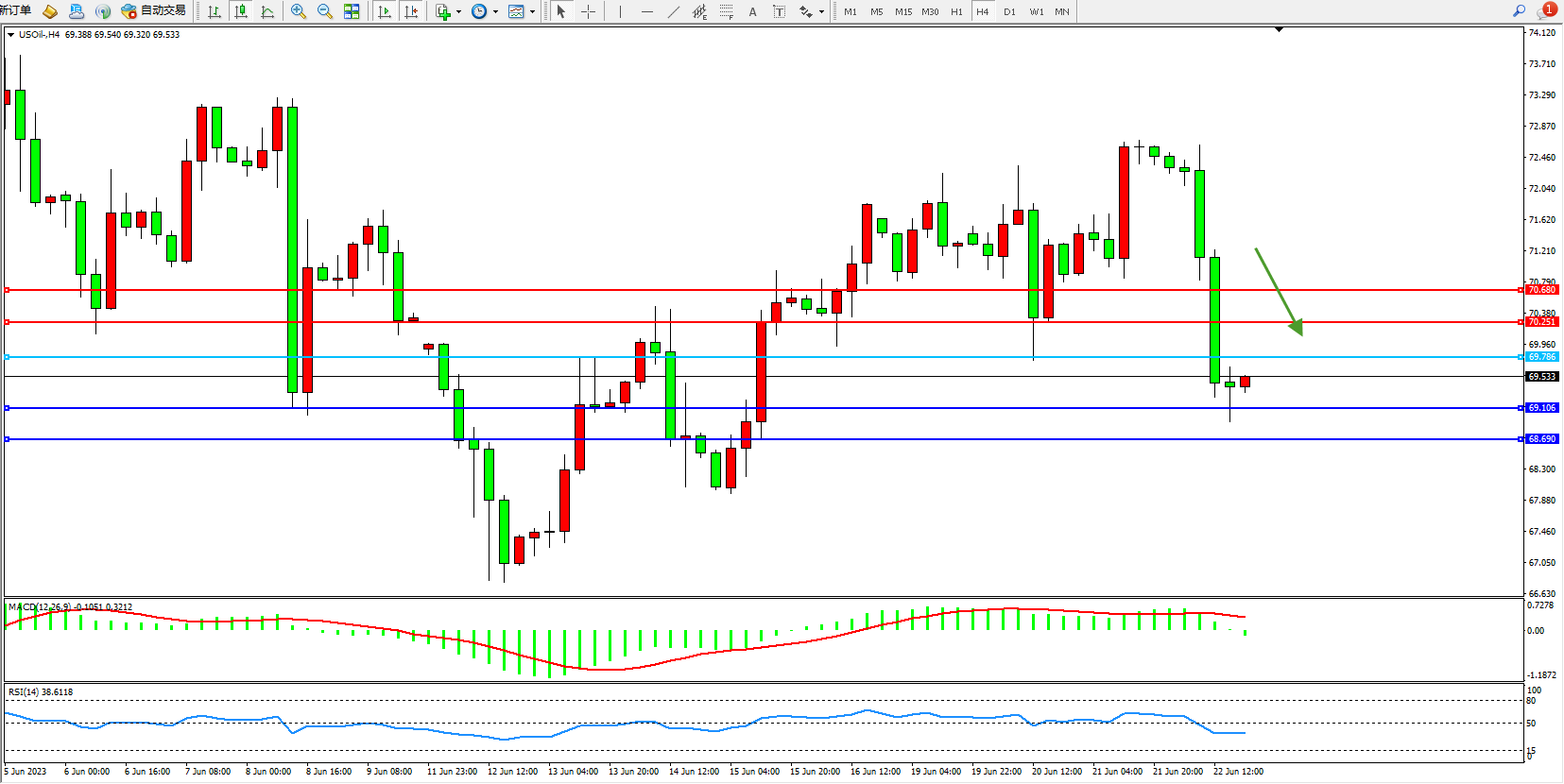 交易策略:69.786下方看跌,目标69.106  68.690