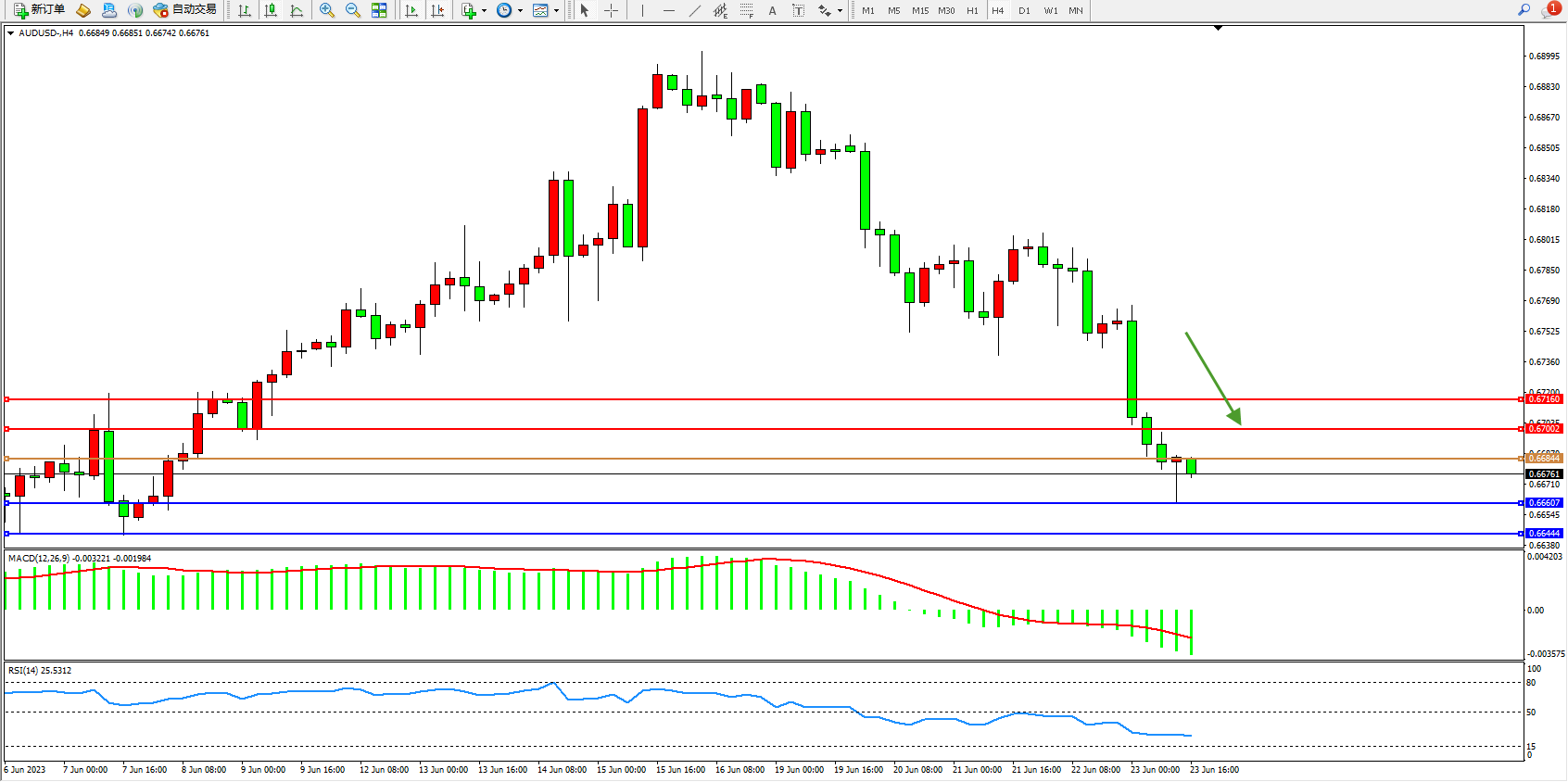 交易策略:0.66844下方看跌,目标0.66607  0.66444
