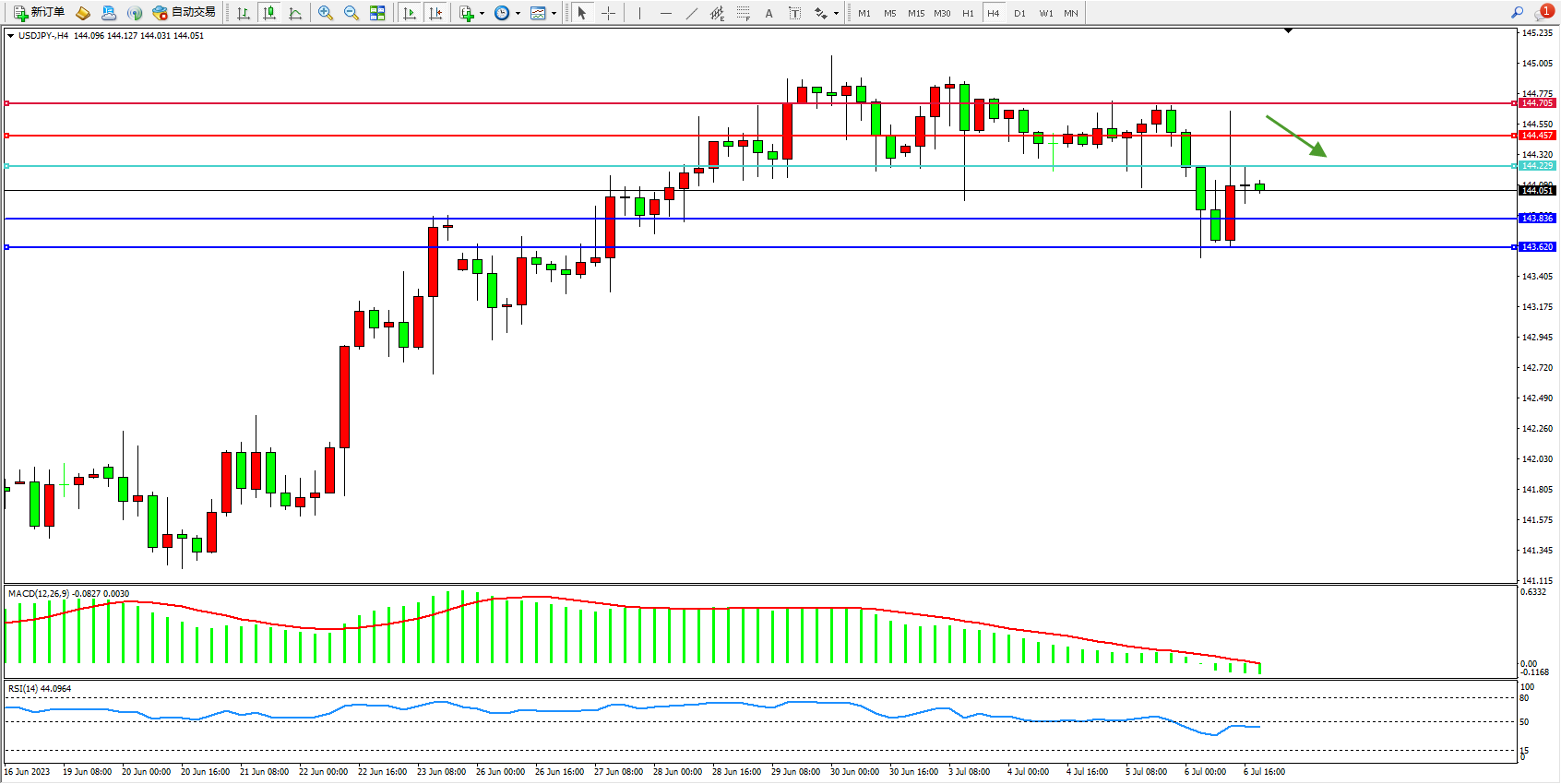4小时图看:高位空头动力维持震荡下行,短期跌势虽有减弱,但依旧处于向下移动走势中,MACD指标处于0轴线下侧弱势整理,RSI指标处于50均衡线下侧弱势徘徊;
