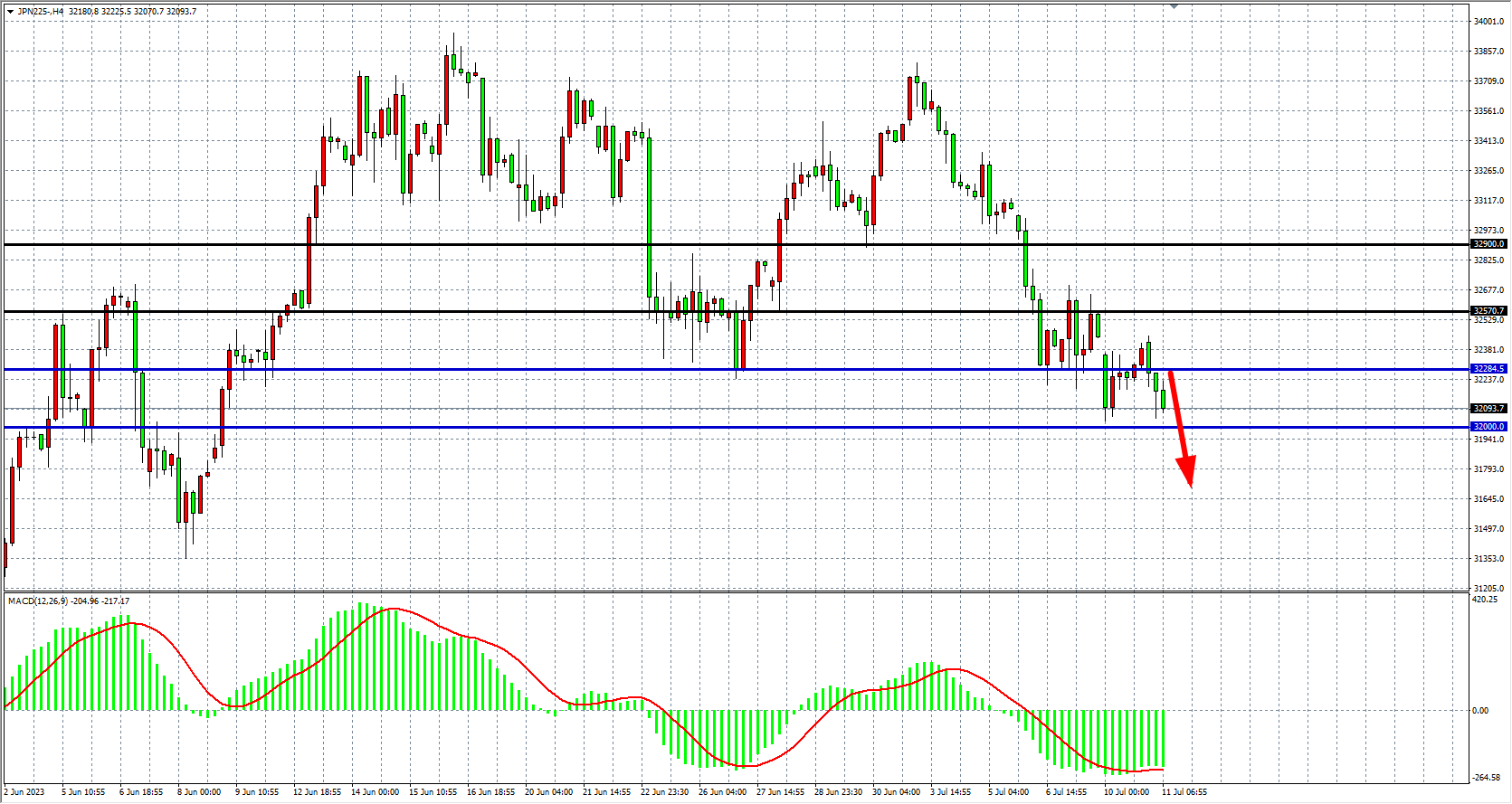 4小时图看,日经指数在32280之下继续走弱,MACD量能在零轴下持续放量,空头行情延续,阻力关注32280-32500,支撑关注32000-31700。