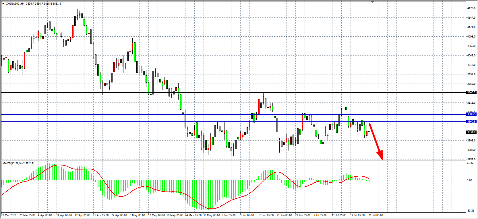 4小时图看,沪深300在3860之下维持若是,MACD量能下穿零轴,行情延续调整,阻力关注3860附近,下方支撑3800-3770。