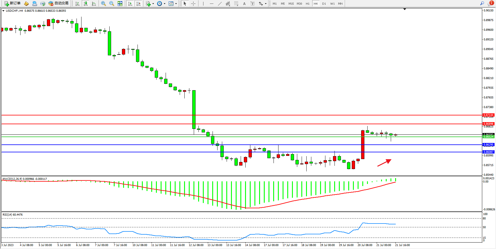 美元瑞郎USDCHF——4小时K线图显示: