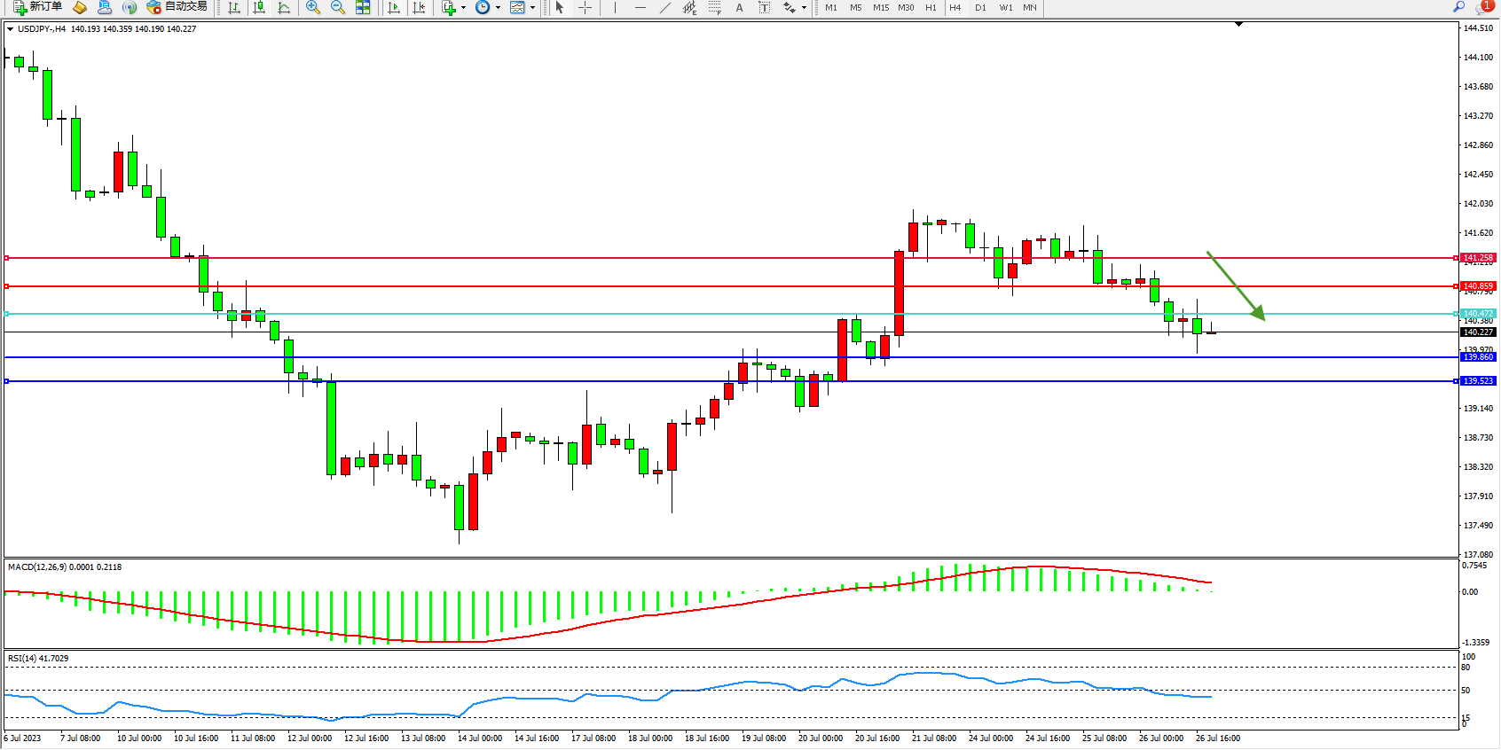 交易策略:140.472下方看跌,目标139.860  139.523