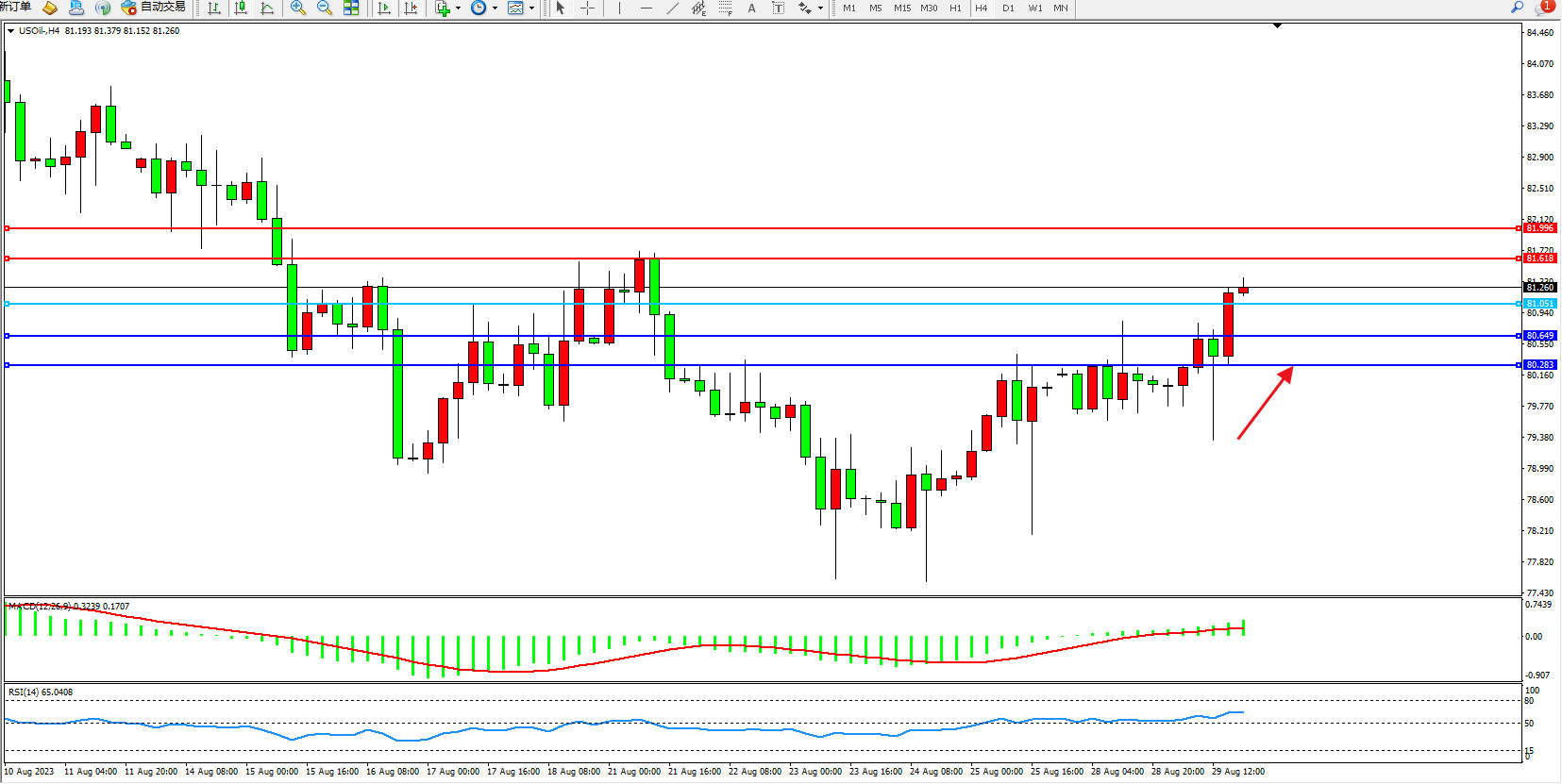 原油USOil——4小时K线图显示: