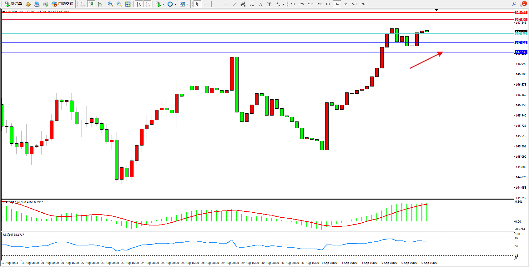 交易策略:147.612上方看涨,目标147.904 148.052