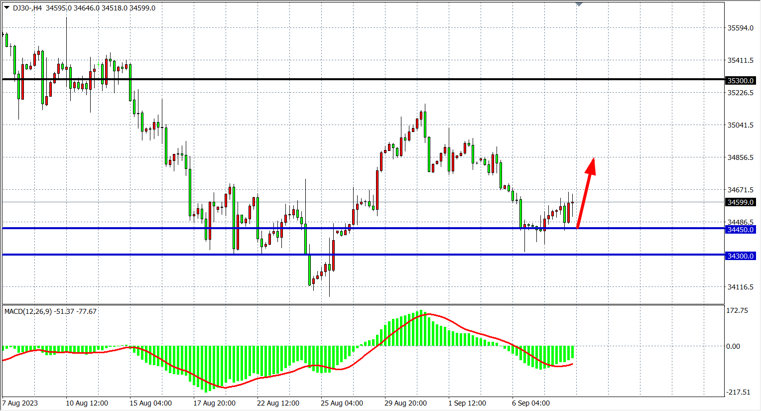 4小时图看,道指在34300之上继续反弹,MACD量能在零轴下缩短,支撑上移34450附近,阻力看上方34750-35000附近。