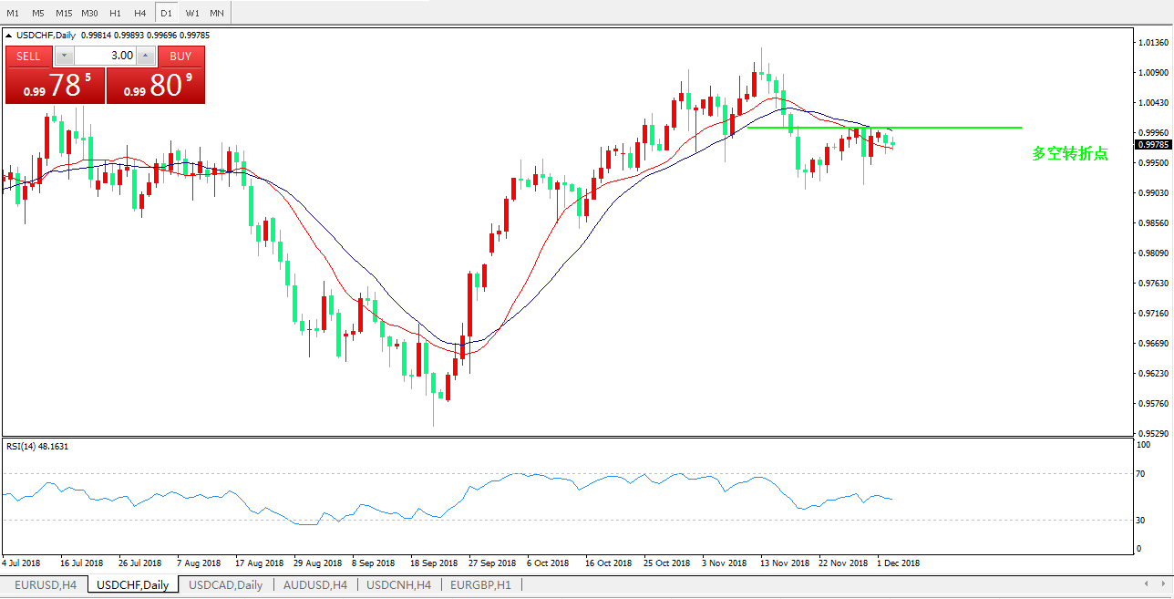 基本面简析:G20传来中美贸易摩擦缓和的信息,金融市场大受鼓舞,美元走软,美联储官员夸尔斯发出鸽派信号。美元瑞郎在整数关口下方承压。