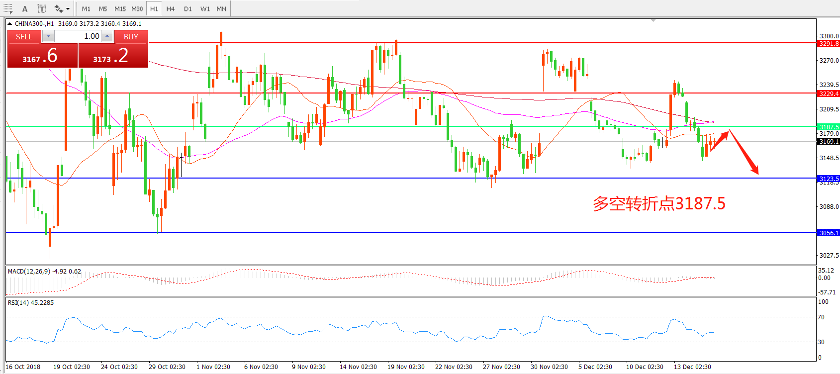 1小时图看,CHINA300中华指数目前处于震荡区间之内,整体价位依然位于3187.5之下, 均线系统逐渐粘合,MACD绿柱缩短,RSI指标向下,日内走势仍以箱型整理为主。