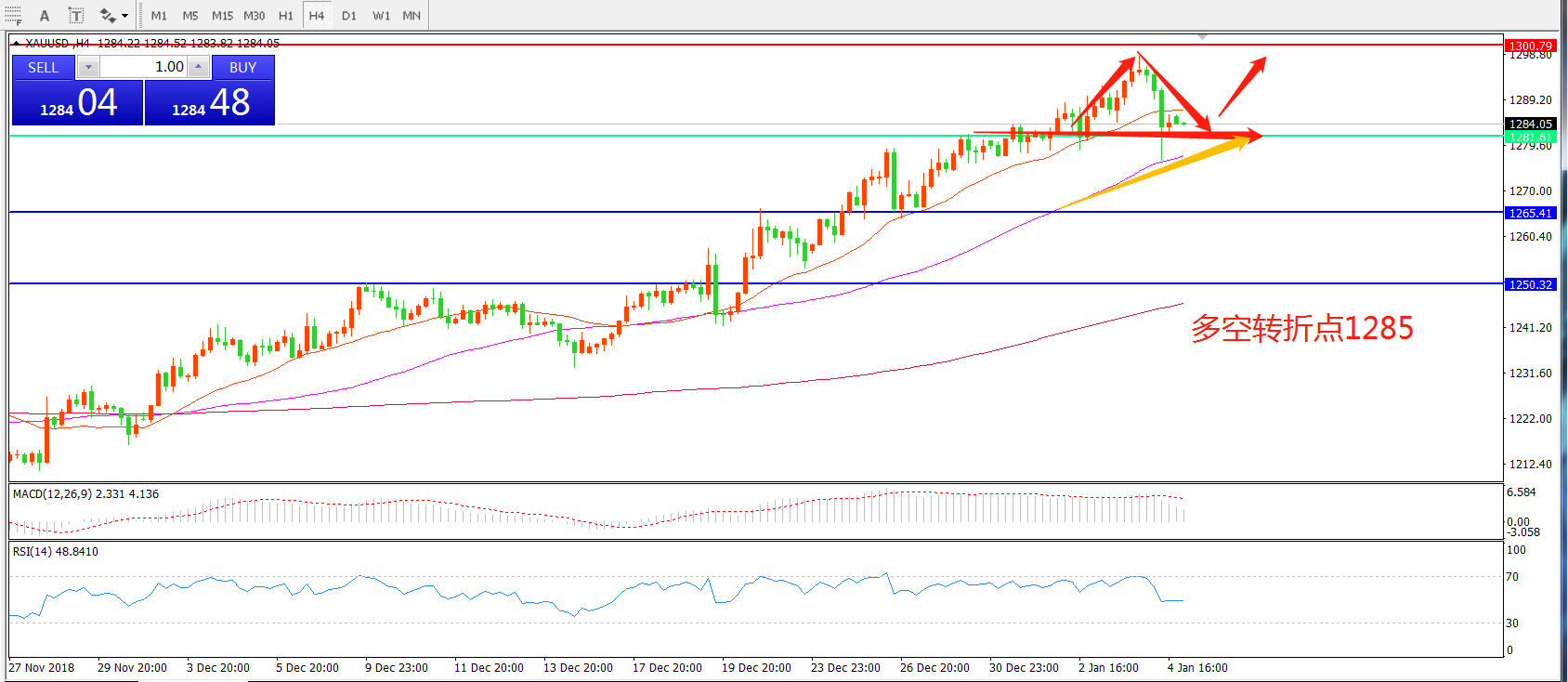 多空转折点:1285.00