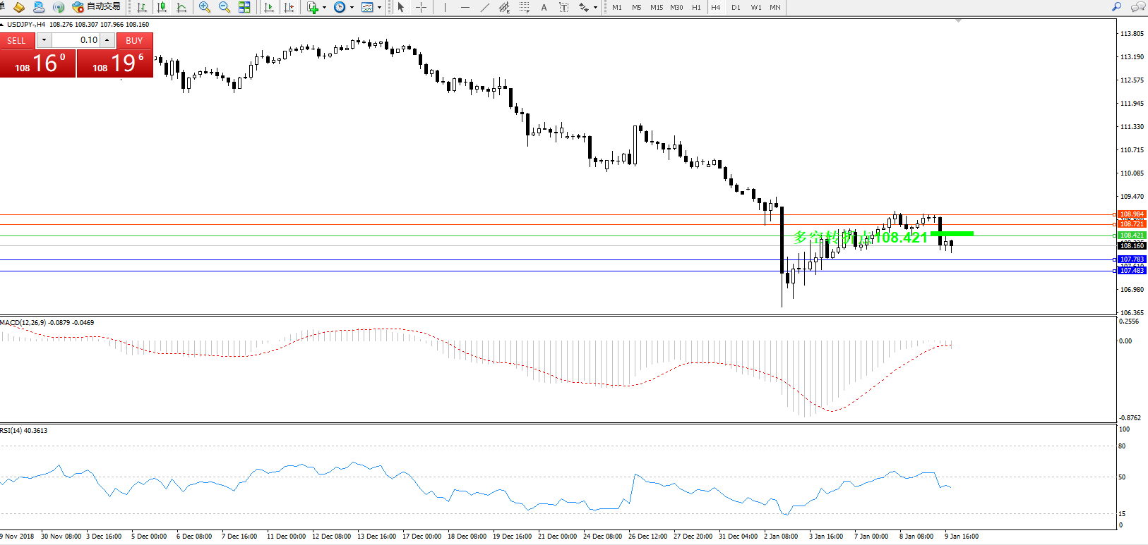 交易策略:108.421下方看跌,目标107.783、107.483