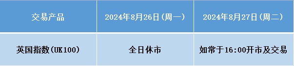 因应2024年8月26 日为英国市场假期,本公司以下产品的交易时间将于假期期间作以下安排,敬请留意。