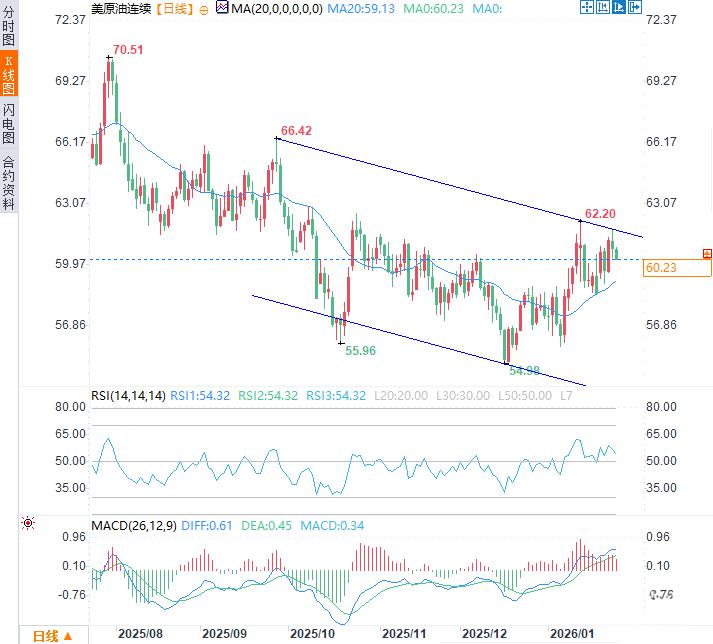 上行方面,首道阻力看向下行通道上轨约61.70美元附近,若有效突破可扭转短期空头主导局面,下一阻力看向1月14日日内波动高点62.20美元。