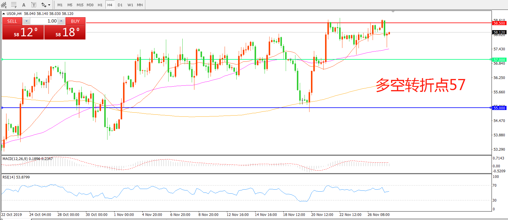周二(11月27日),美国能源信息署公布数据显示,美国EIA原油库存增长157.2万桶,增幅远高于市场预期,利空油价。但中美达成第一阶段贸易协议的乐观情绪料遏制了油价颓势,美国WTI原油小幅下行,收报58.12美元/桶。而昨日有消息人士表示,OPEC的全体会议定于12月5日在维也纳举行,以俄罗斯为首的非OPEC成员国将于次日加入谈判,其中俄罗斯的态度再度成为市场关注的焦点。
