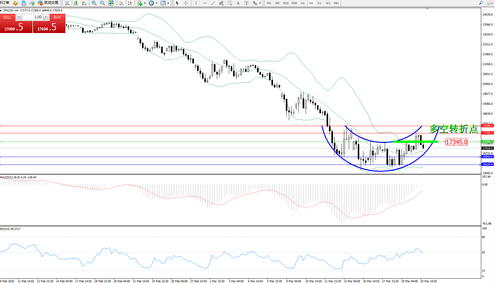 日经指数JPN225——4小时K线图显示: