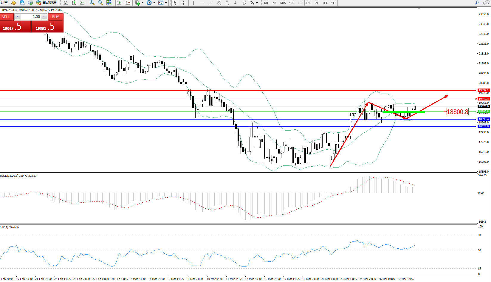 日经指数JPN225——4小时K线图显示: