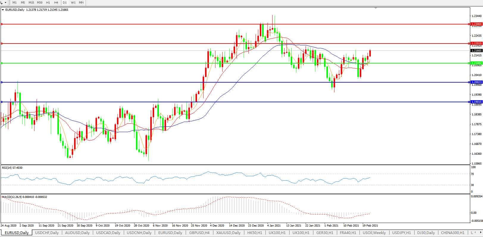 荷兰国际集团表示,欧元上周最后一个交易日收涨,涨势延续至周一(2月22日),开起来有望开启新一波上行走势;但该机构也指出,年初以来,欧元总体处于震荡调整格局中,完全排除进一步下跌的风险,汇价须上破颈线位——2月16日高点1.2169。周一公布的调查显示,德国2月企业信心触及10月以来最高,升幅远大于预期,因尽管有封锁限制,工业领域仍给予德国经济动力。德国商业银行分析师Ulrich Leuchtmann称,欧元兑美元汇率将取决于“美国经济是否真的能实现比欧洲更强劲的后封锁繁荣”。