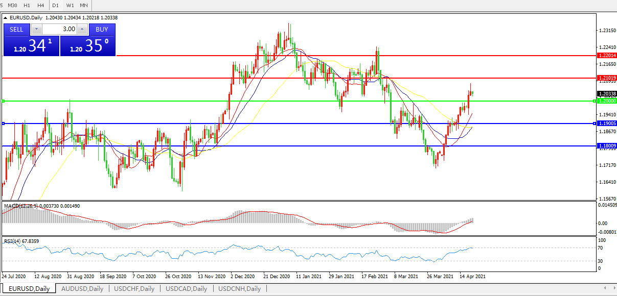 技术面简析:日图均线呈多头排列,汇价上攻遭遇1.21关口压制后小幅回落,MACD上穿0轴且量能有小幅放量迹象,RSI持续走升,预计短期汇价大概率进一步上行。