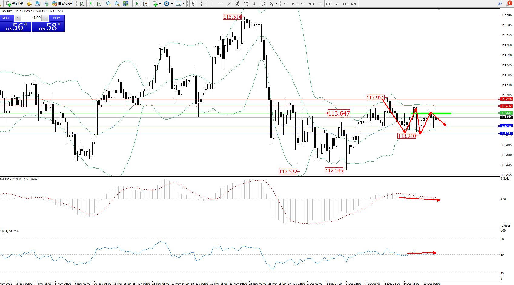 交易策略:113.647下方看跌,目标113.403、113.251