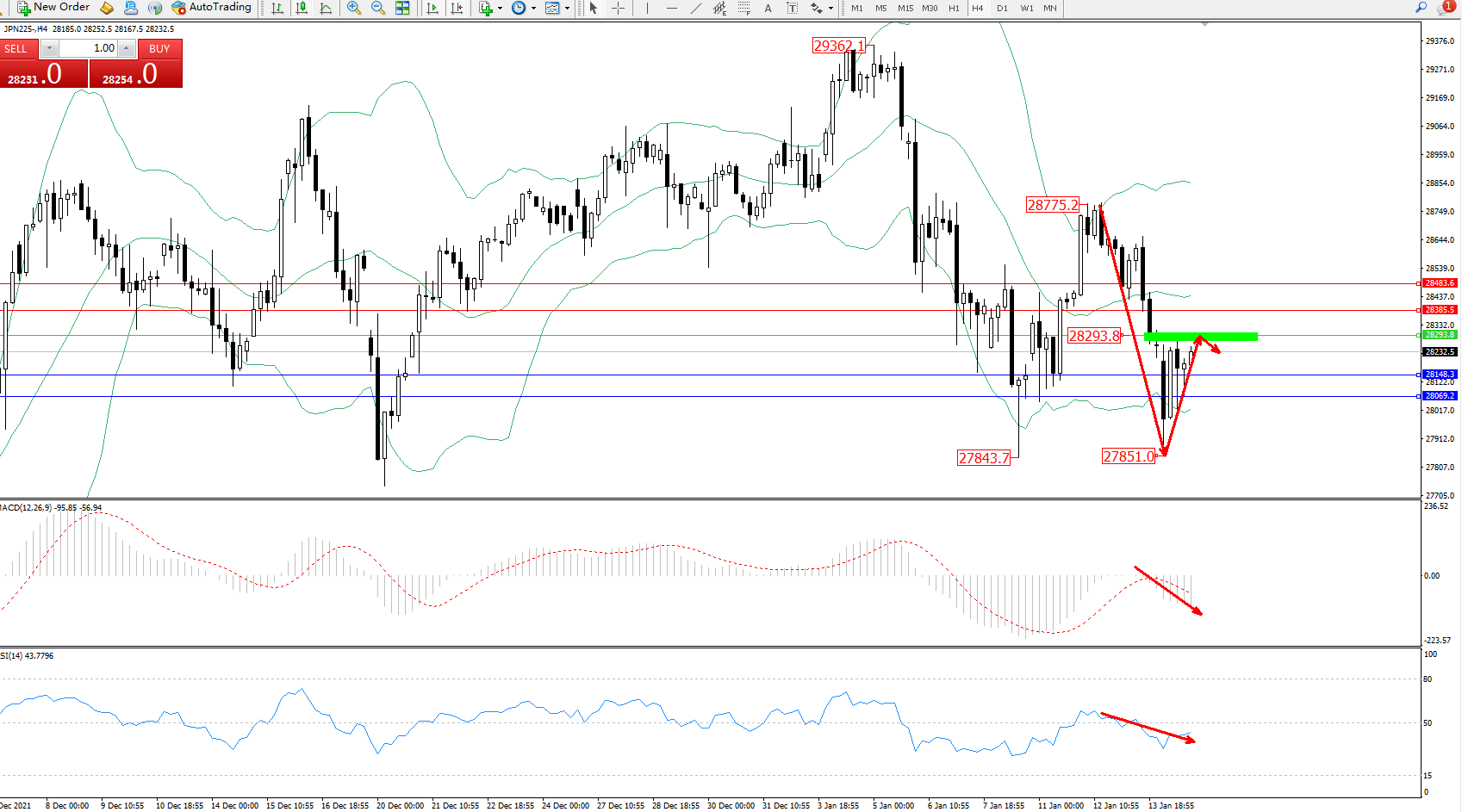 交易策略:28293下方看跌,目标28148、28069