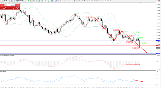 市场空头情绪延续布林带指标通道持续震荡下挫,低位抵达1.28216附近后有继续下探态势,且市场整体跌势未见最终止步迹象,布林带指标呈收口走势后开始逐渐张口,上方压制关注1.300128附近,低位支撑关注1.26842附近节点,关注1.28886附近转折点,MACD指标处于空头区域维持整理平移,RSI指标处于50均衡线下侧维持震荡下行中,如图: