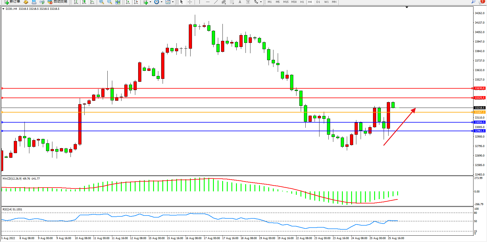 道琼斯指数DJ30——4小时K线图显示:
