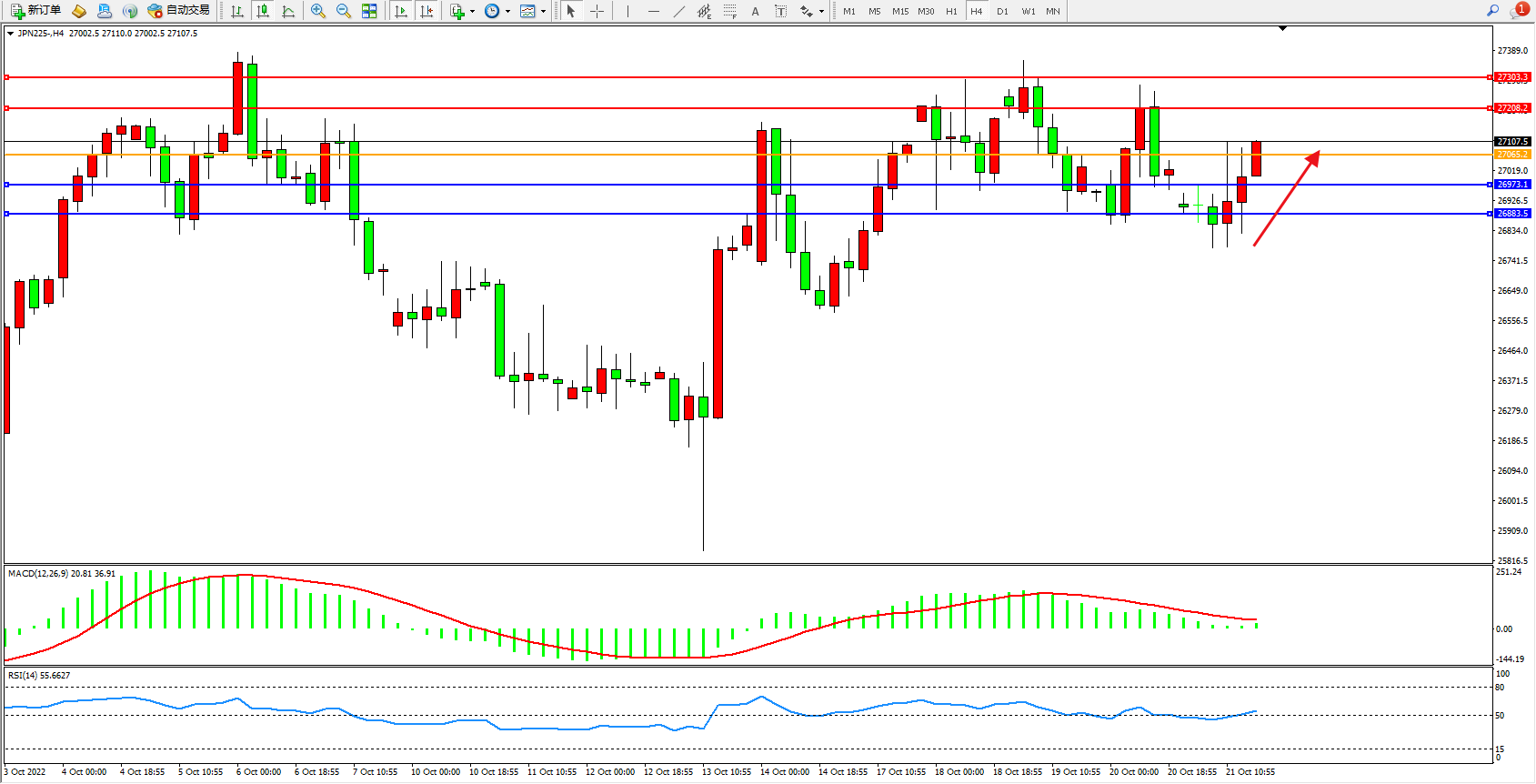 日经指数JPN225——4小时K线图显示: