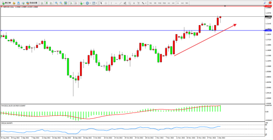 英镑兑美元持续震荡上扬至1.22868附近震荡,受市场情绪影响,有持续攀升态势,市场普遍预计英国央行将在12月再加息50个基点。由于通胀率达到了11.1%,是目标水平的五倍多,英国央行面临着积极应对物价的压力。