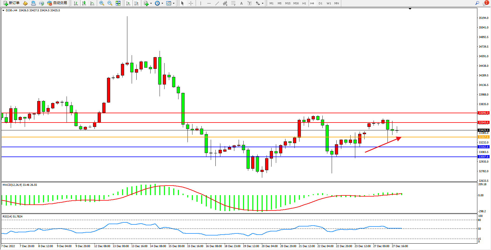 道琼斯指数DJ30——4小时K线图显示: