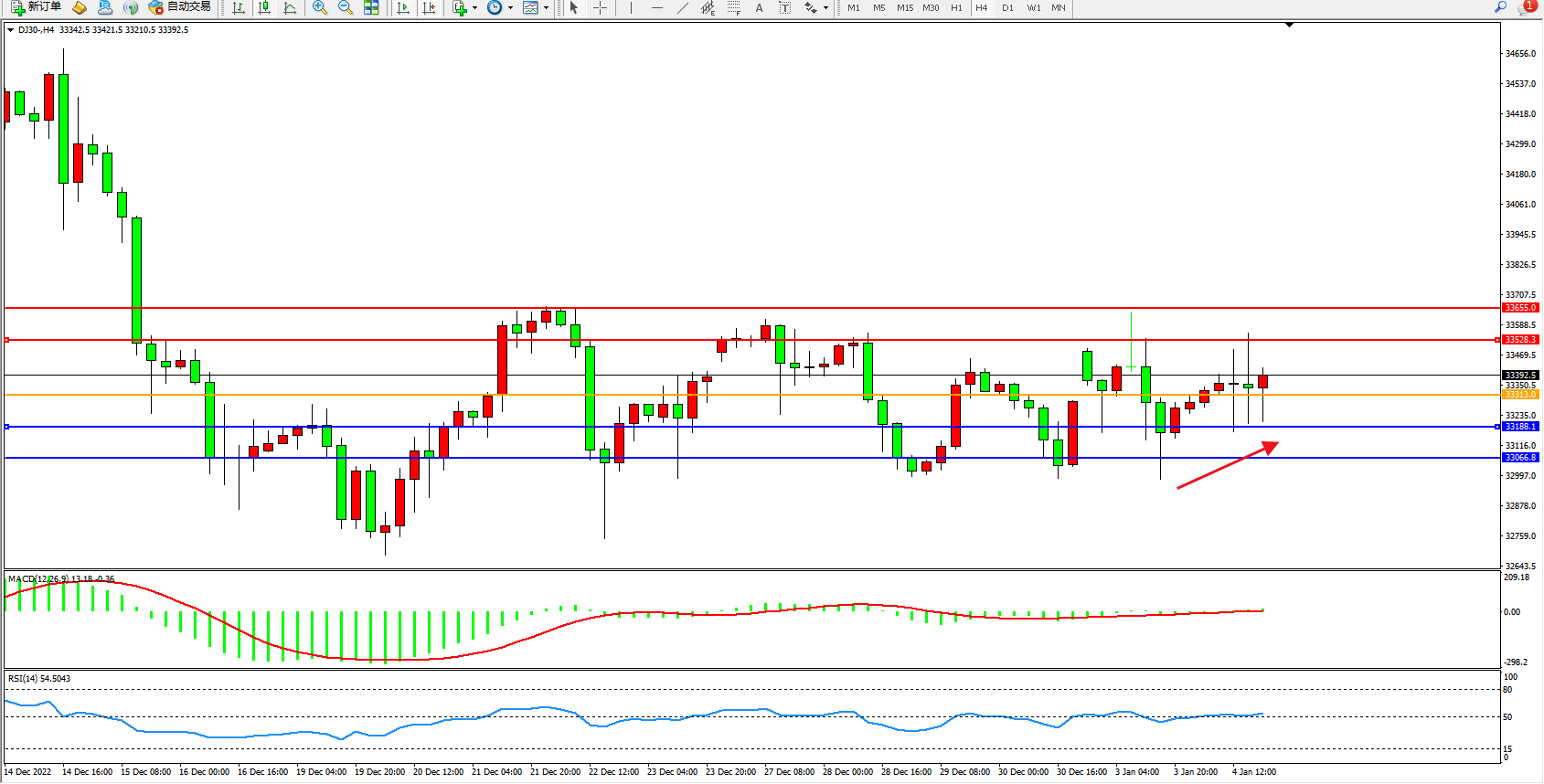 道琼斯指数DJ30——4小时K线图显示:
