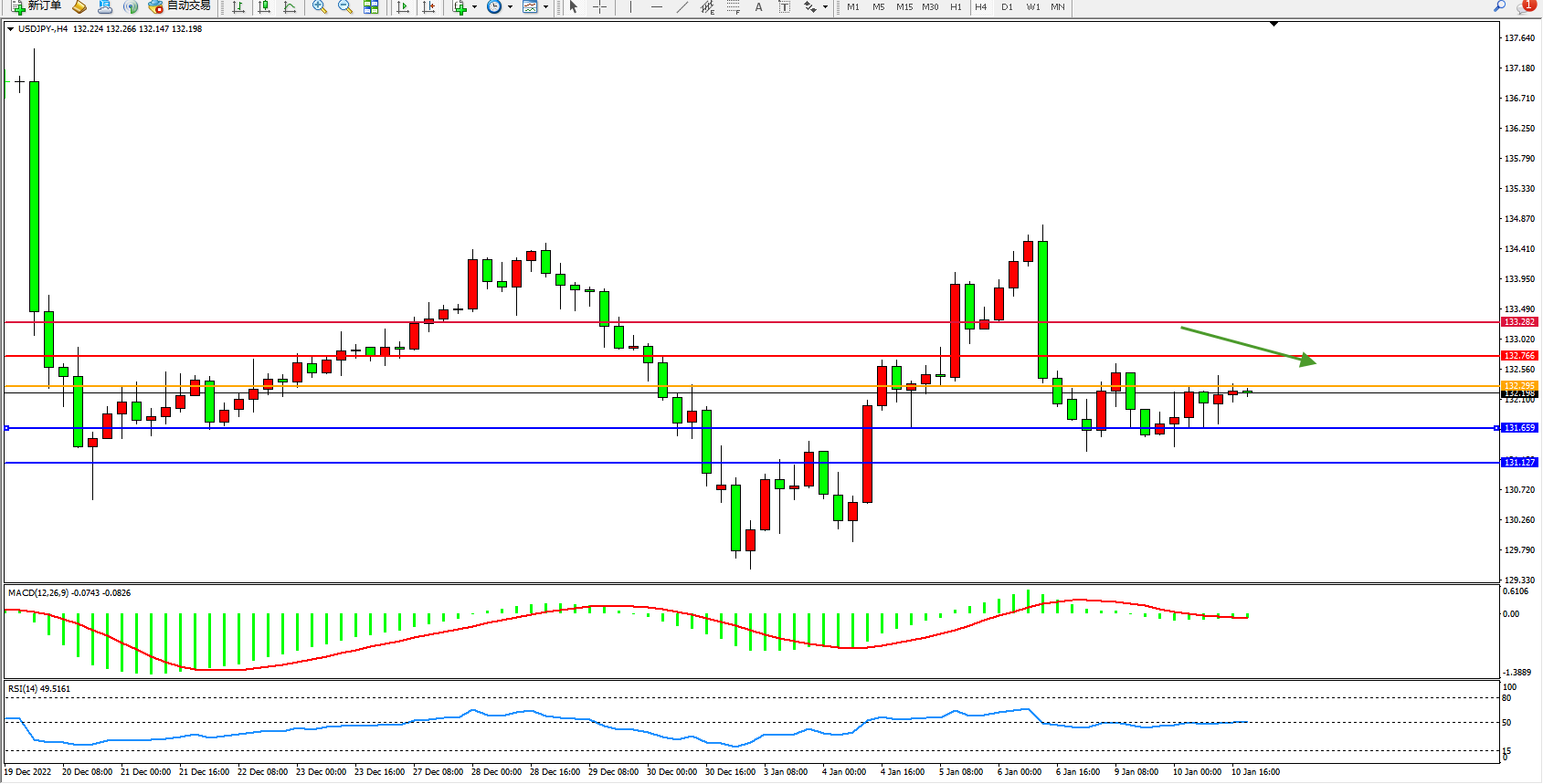 4小时图看:短期维持弱势窄幅整理平移,市场空头情绪有伺机入场迹象,但依旧维持弱势震荡,MACD指标处于0轴线附近弱势徘徊,RSI指标处于50均衡线附近弱势整理;