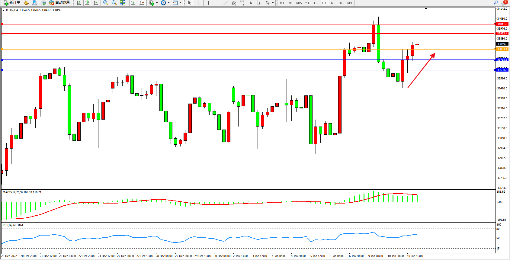 道琼斯指数DJ30——4小时K线图显示: