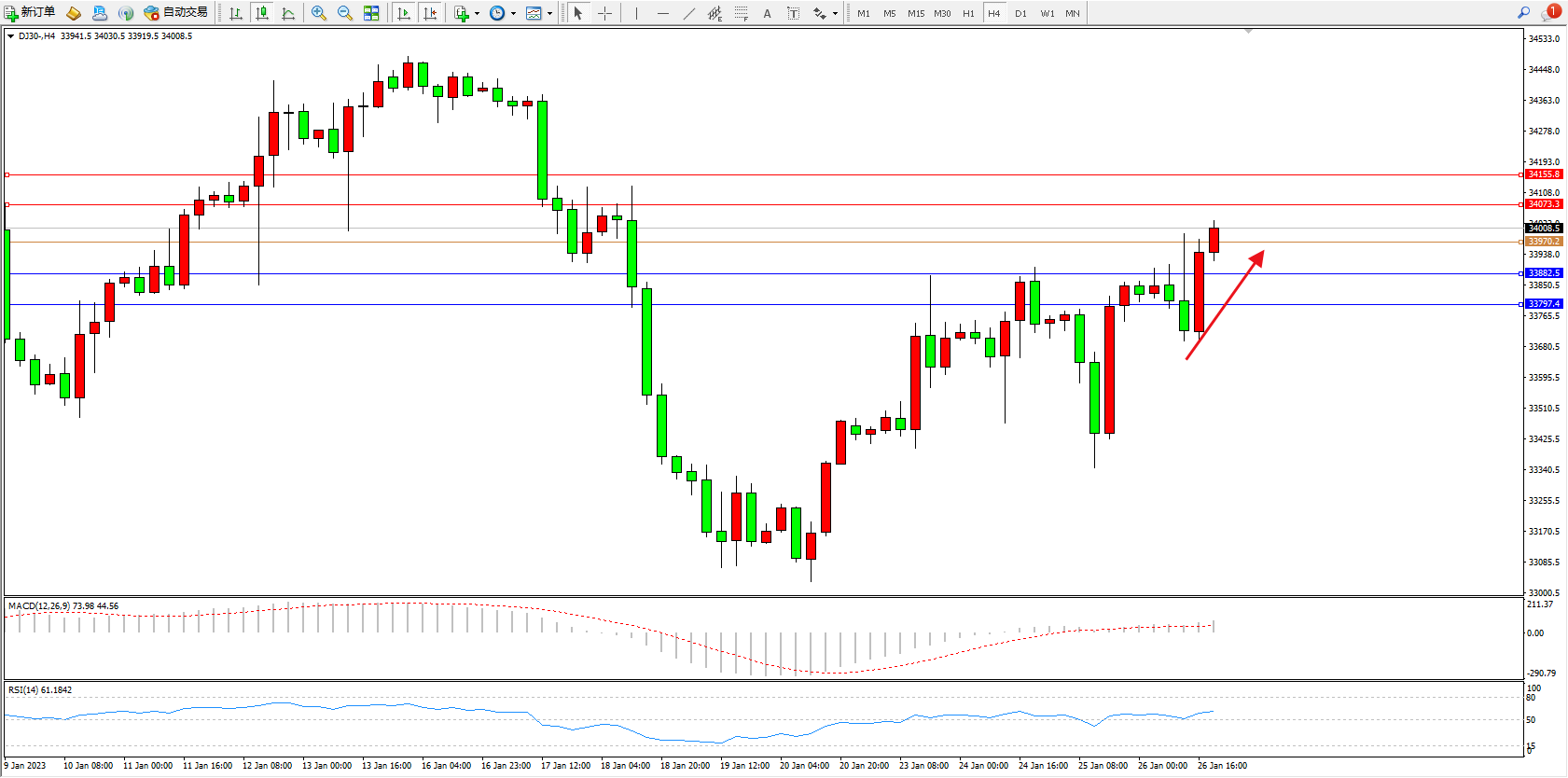 道琼斯指数DJ30——4小时K线图显示: