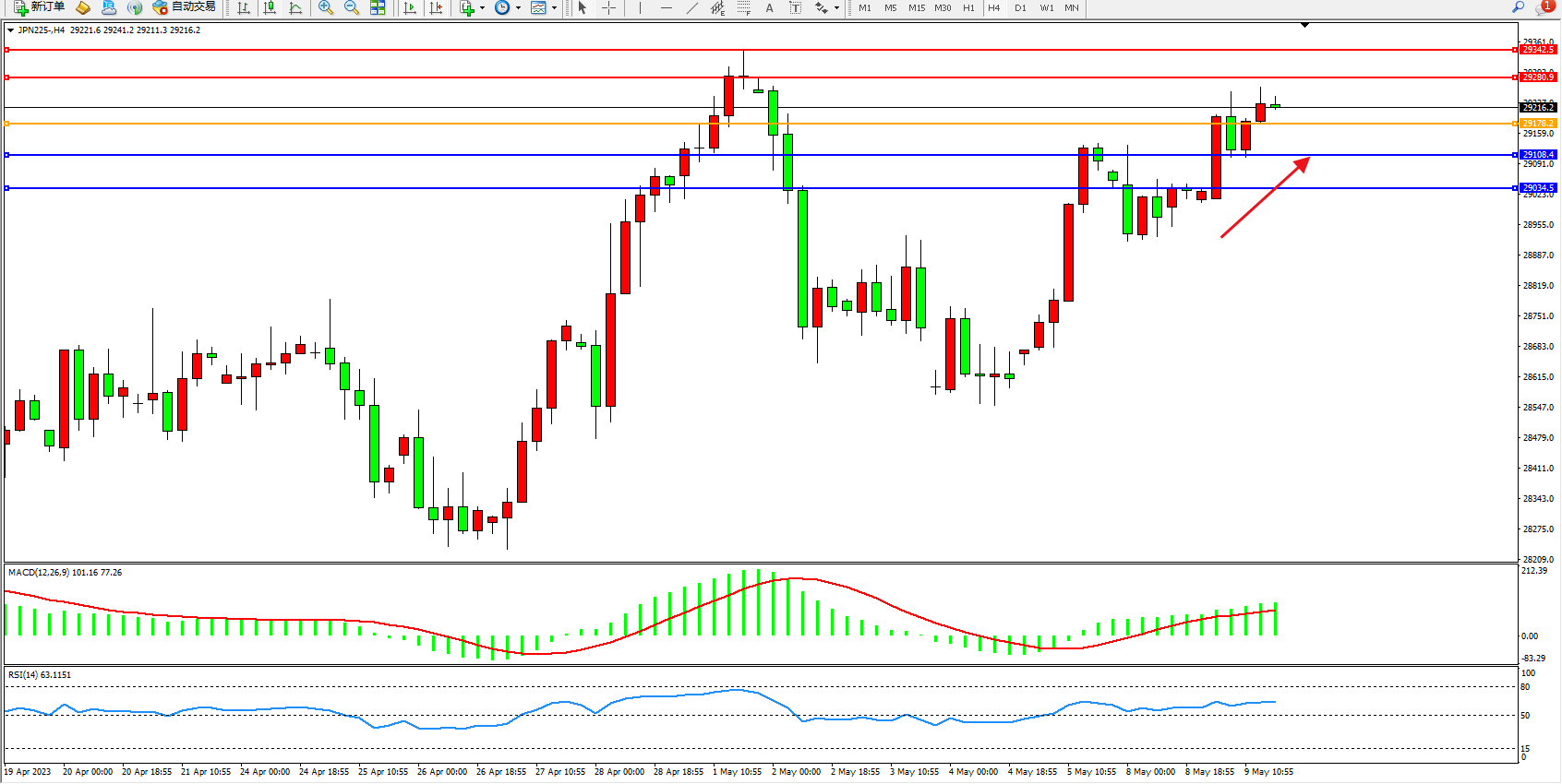 日经指数JPN225——4小时K线图显示: