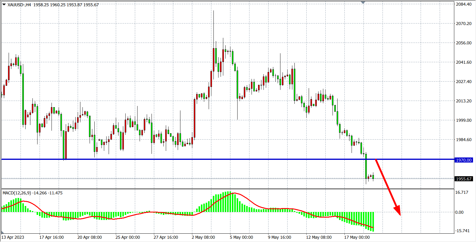 4小时图看,黄金下跌进入加速,MACD量能在零轴下放量,行情趋势延续下跌,当前阻力下移至1970附近,在该位之下继续看跌1940-1920附近。