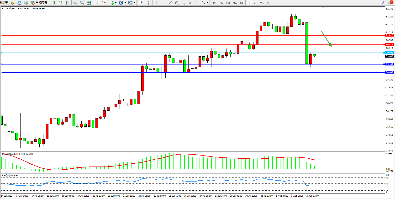 原油USOil——4小时K线图显示:
