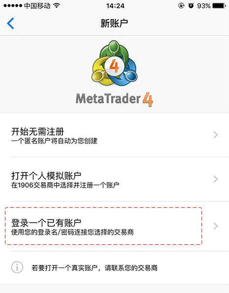 1. 成功安装 MT4 后,在手机桌面上点击 MT4 图标打开应用。首次打开时页面显示如下。